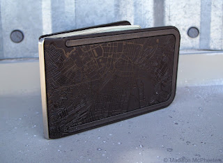 The wallet in this review, Colony, was inspired by the street layout of Sydney, Australia, where Dosh is headquartered. The two outside panels of the wallet each have an individual map. Each road is very detailed and sharp. There are even tiny, tiny grooves to represent a highway with multiple lanes. If you assume that black-on-black embossment wouldn't show up well, you would be wrong. The etched portion of the wallet has a glossy finish, while the relief portion has a matte finish. Because of this, it shows up clearly.