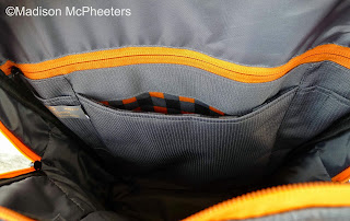 Let’s take a tour of this backpack. We’ll start with the exterior. The Polygon Sunfire has a sporty, eye-popping color scheme and an edgy, modern style. Zipper trim is a dazzling shade of bright orange and the water resistant exterior fabric is grey. The Surefire's fabric is extremely durable and tough. You could probably cut at it with a kitchen knife and not damage it.