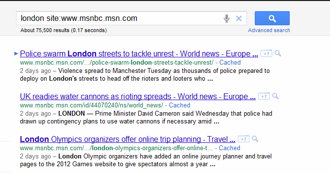 2. Are you looking for a page on a website, but there's no search box in sight? For our example, let's search for London on the site MSNBC. I type in London site:www.msnbc.msn.com, and voila! Substitute London with your search term of choice and www.msnbc.msn.com for the website your are querying.