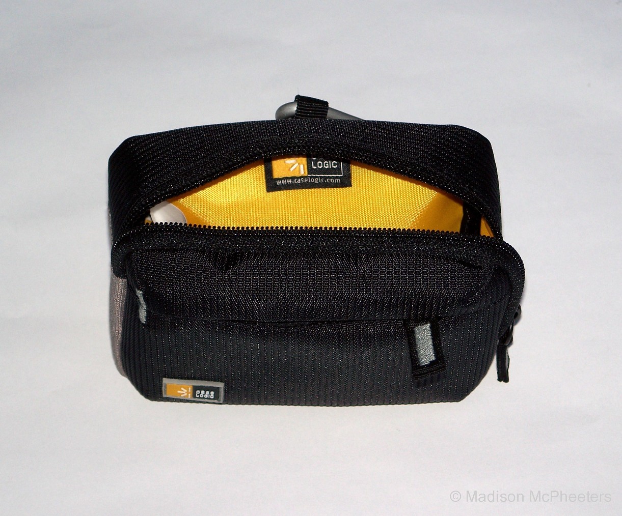 This camera/camcorder case has two main compartments, each lined with bright, sunshine-yellow fabric. The front pocket affords you easy access to spare batteries, cables, etc. Inside the case, the main compartment stows your camera. The whole case is very well padded and cushy, but is less protective than the hard case I reviewed here.