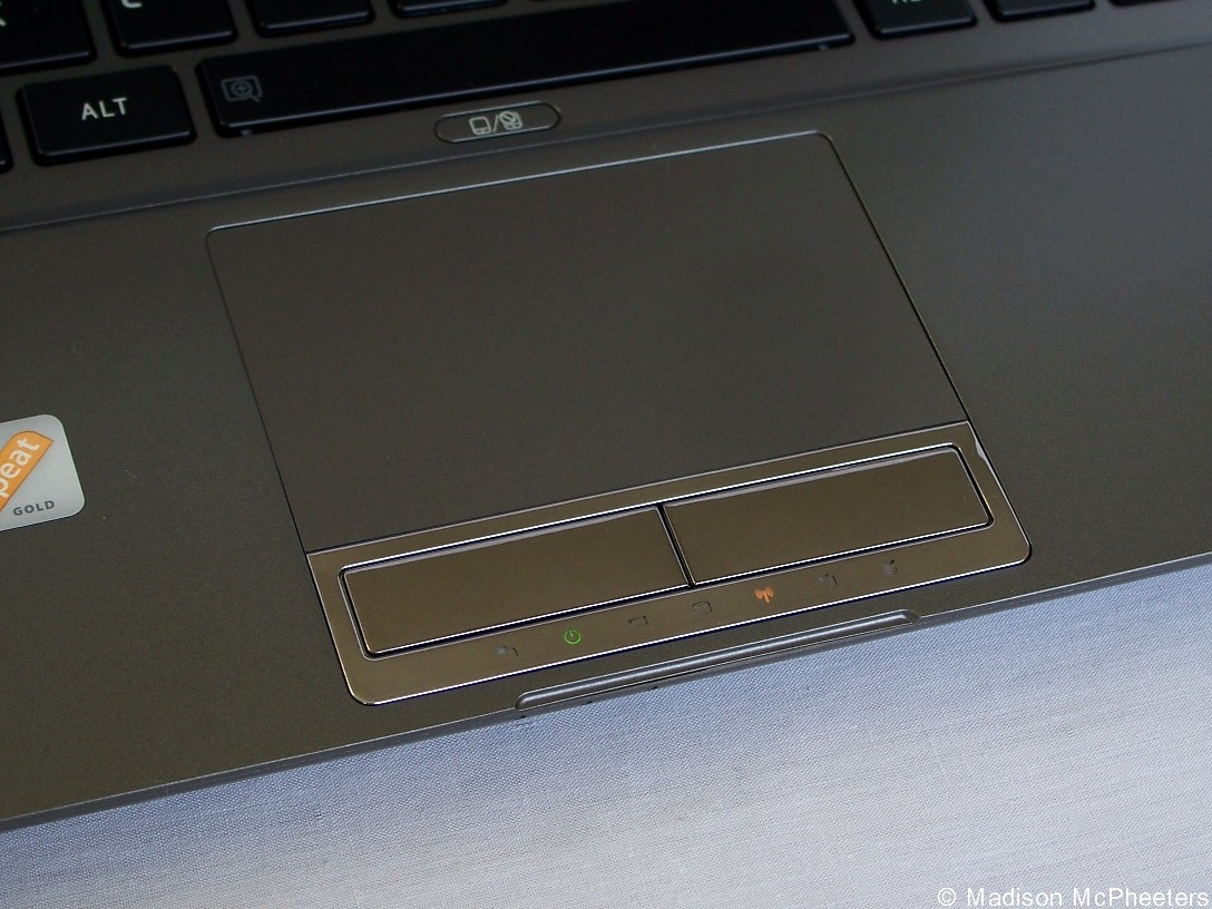 Let’s take a tour around the Z835. The lid sports a chrome Toshiba logo. On the keyboard deck reside a power button, a button that launches the Toshiba Eco Utility, and a button that launches the Intel Wi-Di software. A button that turns the touchpad on and off is below the space bar. Personally, I would appreciate the cleaner look of a few less buttons, but that is a minor nitpick.