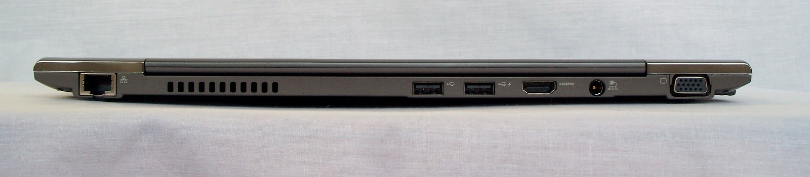 Toshiba has not done anything particularly unique or inspiring with its ultrabook. Closed, it looks like.....a regular (albeit skinny) laptop. The overall impression is kinda...bland. The body is grey, with a few chrome accents. On the plus side, the finish doesn’t pick up finger prints!