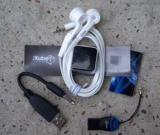 In the box, you get a Kube2 Mp3 player, a skin (the blue sticker on the right), a 4GB MicroSD card with USB card reader, a pair of earphones, and a charging cable.