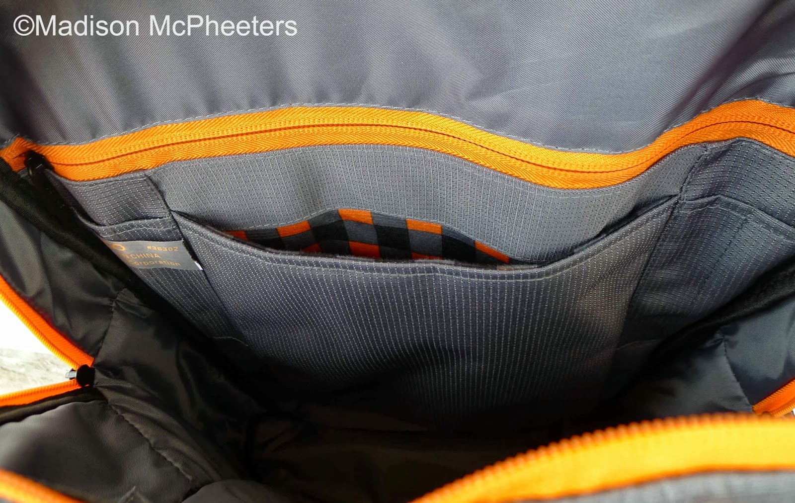 On the front of the backpack, there is a zippered compartment that has two phone-sized pockets and two pockets for individual pens or pencils. This interior fabric has a glossy, satin finish. Two small pockets are on the sides of the backpack. These are covered up by the front flap straps when closed. Next, there is a zippered shallow pocket on the front flap. In case you haven’t noticed, there are a lot of zippers on the Polygon! On the three largest compartments, there are two zipper pulls. They all operate smoothly and have long, Altego-branded metal zipper pulls.
